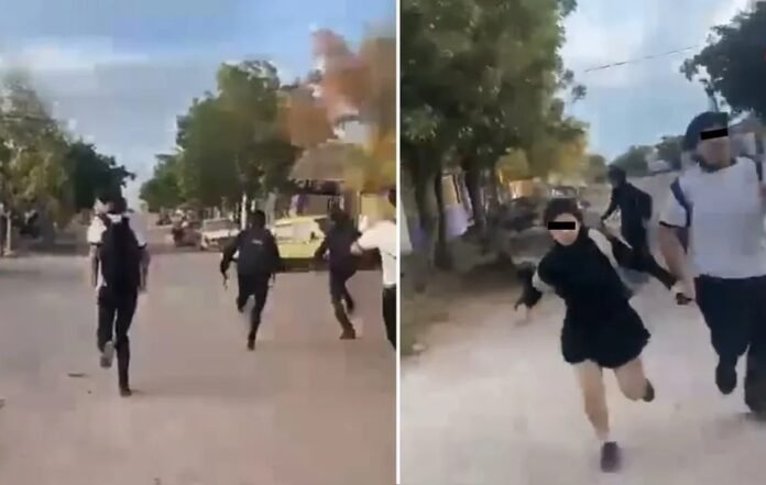 En las imágenes, se puede ver a los estudiantes corriendo rápidamente en línea recta por una calle, cruzando otras avenidas con una notable urgencia. Después de poco más de 30 segundos de angustia, logran alcanzar una casa en la que esperan encontrar seguridad.
