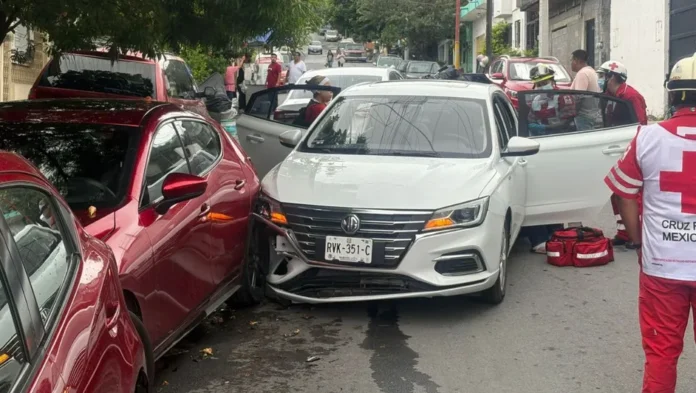 Un automóvil MG impactó a otro vehículo Mazda que estaba estacionado, mismo que salió proyectado contra otra unidad, que también estaba detenido.