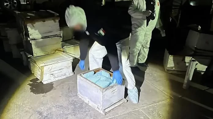 Una vez ahí personal especializado en el manejo de abejas encontró en el interior de algunas de las cajas aproximadamente 125 kilos de fentanilo; de los cuales cuatro kilos corresponden a droga en polvo, y 121 kilos a alrededor de un millón 210 mil pastillas.